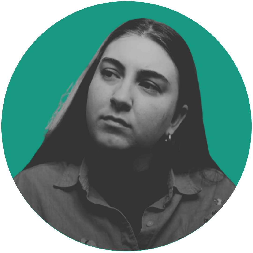 Black and white portrait of a woman with long dark hair, wearing a collared shirt, looking to her left, with a teal background and geometric design elements.